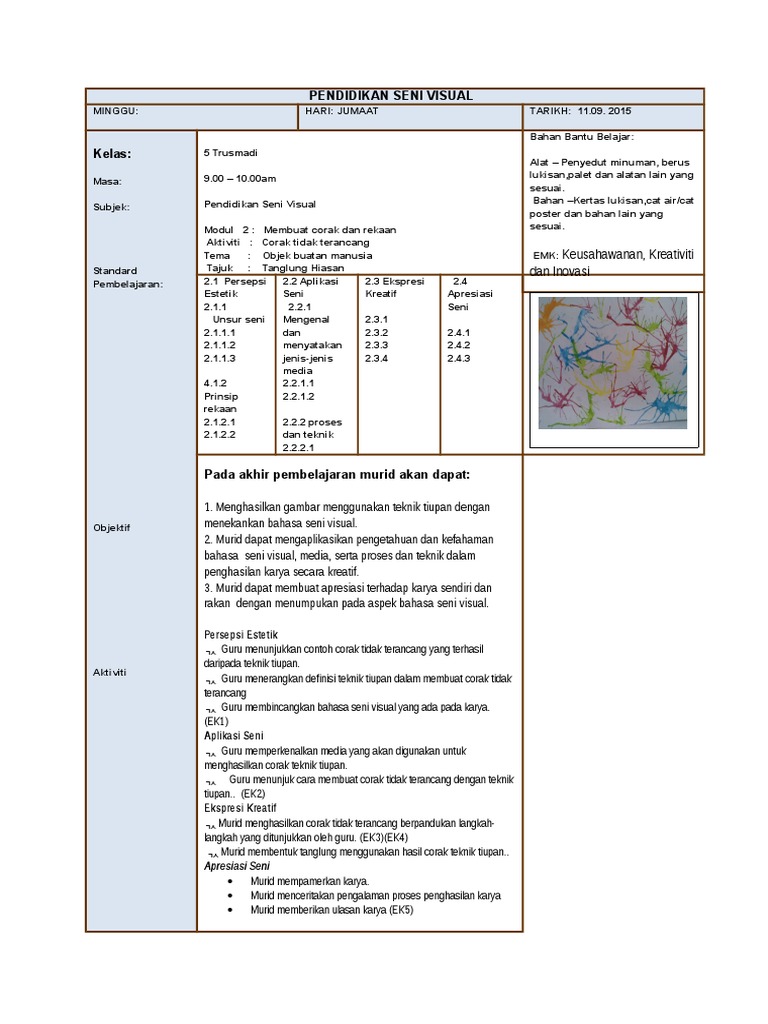 Alam semula jadi atau objek buatan manusia aktiviti : Rph psv tahun 6full description. Fliphtml5 software co., ltd., established in 2010, is headquartered in china, with branch offices in hongkong china. Bahasa seni visual other contents: Rpt ini telah disesuaikan mengikut tarikh dan minggu pada tahun 2016. Para calon pendidikan seni visual spm 2017 bolehlah muat turun soalan kajian rekaan seni visual (krsv) 2611/3 tahun 2017 di sini 14 nov 2016. Selari dengan perkembangan pesat teknologi digital, kementerian pendidikan malaysia akan menggunakan teknologi dan kandungan digital dalam dalam bidang pendidikan. Blog ini mengandungi hasil kerja dan aktiviti pengajaran dan pembelajaran pendidikan seni tahun 5. Rph pendidikan seni visual tahun 5 adalah rancangan pengajaran harian yang perlu disediakan lebih awal oleh guru sebelum menjalankan sesi pegajaran dan pembelajaran.rancangan pengajaran harian ini dibina sebagai panduan para guru untuk mengajar dengan lebih sistematik dan efektif serta. Soalan pendidikan seni tahun 4 by shika nara 7850 views. Di bawah terdapat 4 bidang berdasarkan bidang pendidikan seni visual.setiap bidang ada soalan.pilih satu soalan sahaja dan lukiskan lukisan kamu pada kertas lukisan yang disediakan. Bidang / strategi minggu hasil pembelajaran objektif tajuk p&p aras 2 c. We supply to customers all over the world.
